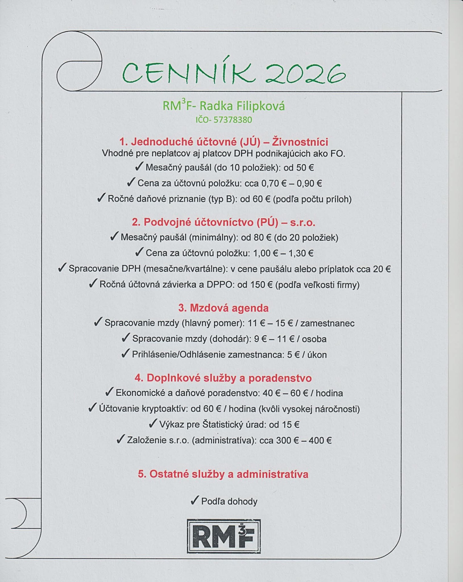 V našej účtovnej kancelárii RM³F sme si stanovili za cieľ ponúkať kvalitné a spoľahlivé služby v oblasti finančného poradenstva pre živnostníkov. Naša ponuka zahŕňa rôznorodé služby ako účtovníctvo, daňové poradenstvo, prípravu daňových priznaní a ďalšie súvisiace činnosti.